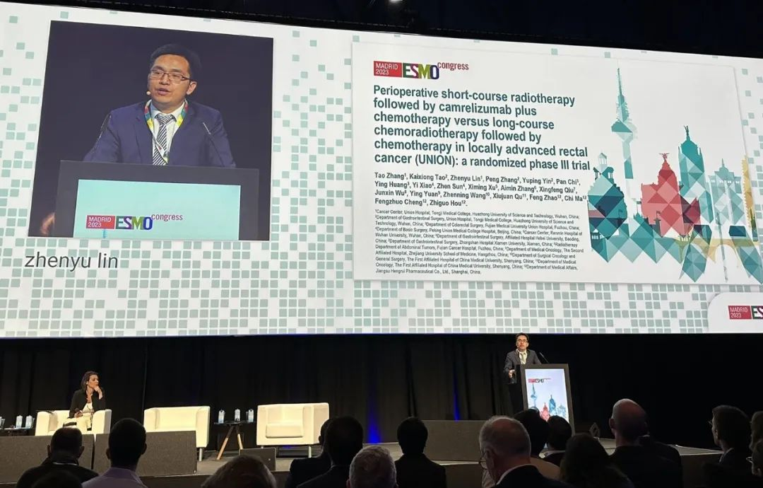 10月21日,九游会医药创新药卡瑞利珠单抗的一项研究“新辅助短程放疗序贯卡瑞利珠单抗联合化疗对比长程放化疗序贯化疗治疗局部晚期直肠癌”随机对照Ⅲ期试验(UNION)亮相2023 ESMO大会优选口头报告现场。该研究由华中科技大学同济医学院附属协和医院张涛教授、陶凯雄教授担任主要研究者,华中科技大学同济医学院附属协和医院林振宇教授在大会现场报告了该重磅研究的结果1。此项研究是全球首个评估短程放疗序贯免疫治疗联合化疗治疗局部晚期直肠癌的Ⅲ期研究,已达到主要终点病理完全缓解(pCR),有望为直肠癌患者的治疗提供新策略。