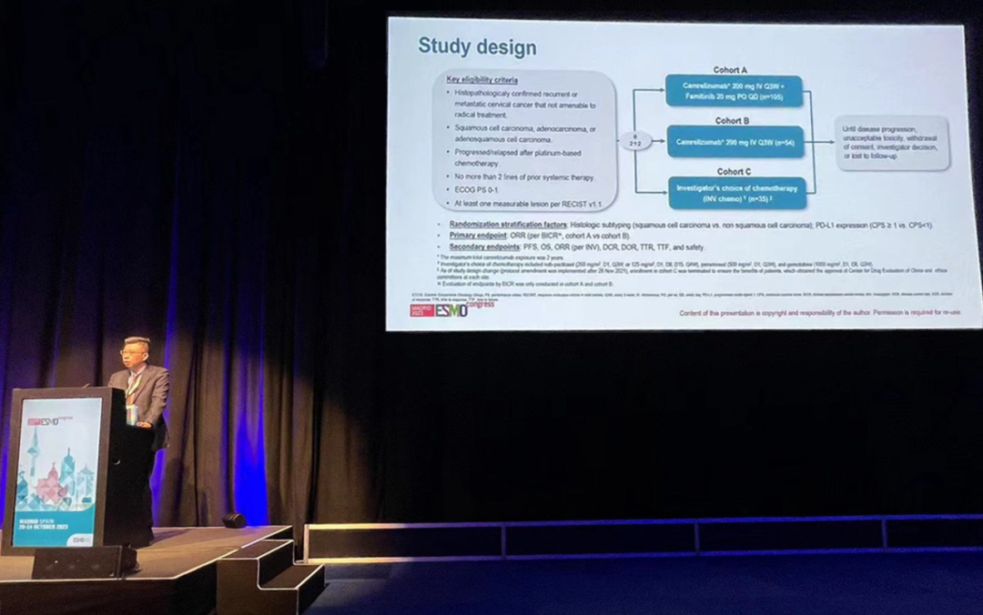 有望为宫颈癌患者带来治疗新选择10月22日,九游会医药创新药卡瑞利珠单抗联合法米替尼对比卡瑞利珠单抗单药或研究者选择的化疗治疗复发转移性宫颈癌随机、开放、对照、多中心的Ⅱ期临床研究(SHR-1210-Ⅱ-217) 亮相2023 ESMO大会简短口头报告现场3。该研究由复旦大学附属肿瘤医院吴小华教授团队开展,吴小华教授在现场公布了该重磅研究进展。研究结果显示,在既往以铂为基础化疗失败后复发或转移性宫颈癌患者中,与单独使用卡瑞利珠单抗或研究者选择的化疗相比,卡瑞利珠单抗联合法米替尼显著提高了抗肿瘤活性,安全性可控,有望为晚期宫颈癌患者提供新的治疗选择。